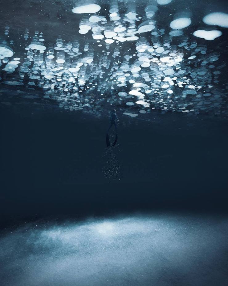 Seeing this natural phenomenon with my own eyes was breathtaking. These air bubbles get frozen and trapped in the ice! This photo was photoshopped to show my imagination of how it looked from underneath the ice sheets! If you want to see the before and after check my story!
